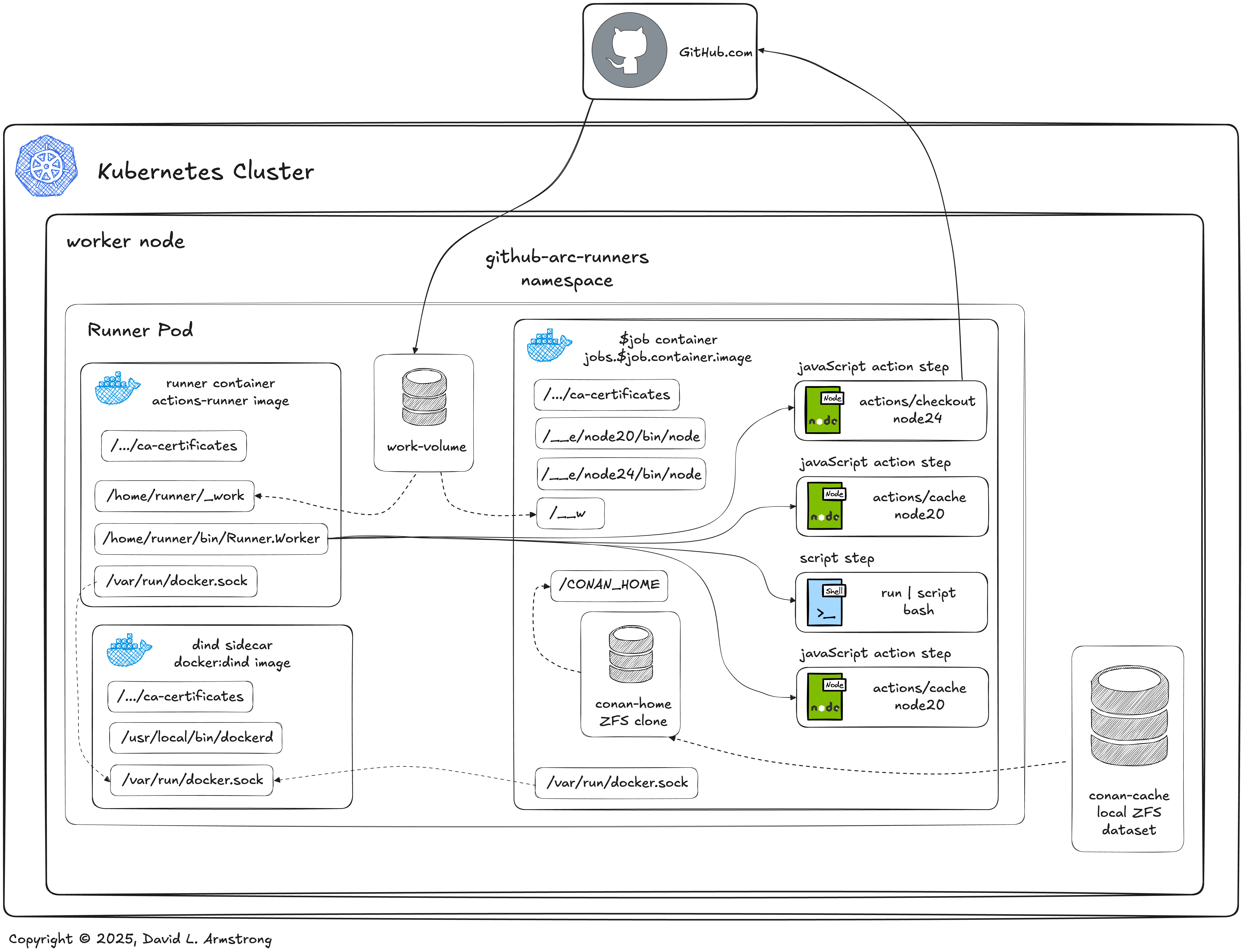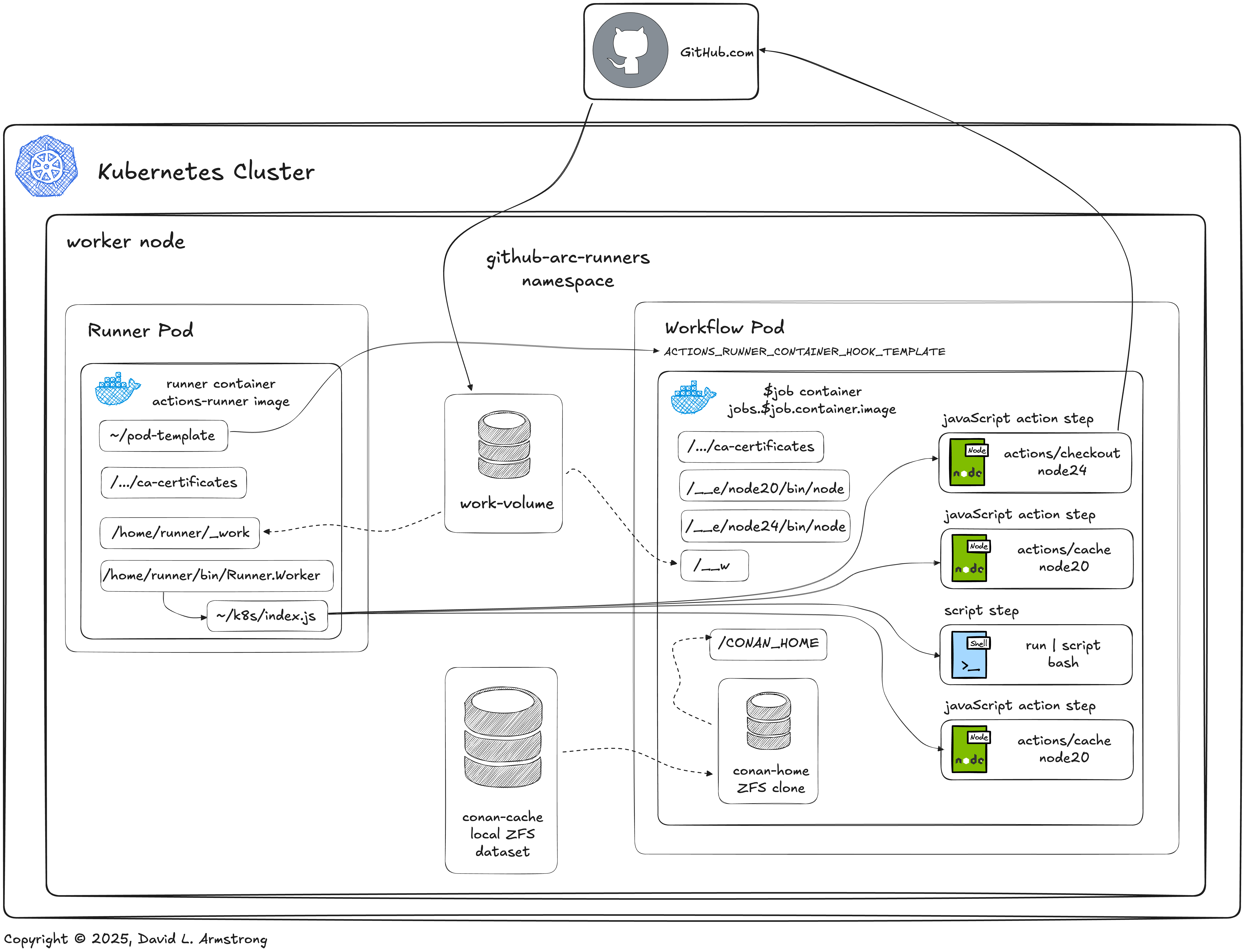 In order to work with our ZFS Conan cache using GitHub ARC Runners, we first need to look at how GitHub Actions Runners behave when using GitHub ARC. Out of the box, GitHub ARC's RunnerScaleSet includes a containerMode configuration option which probably affects the Runner's behavior more than all other options. On the workflow side, choosing whether to run in a container or not will affect the behavior of this solution the most.