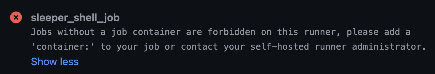 5. If a job doesn't specify a container, exit with an Error: Error: Jobs without a job container are forbidden on this runner