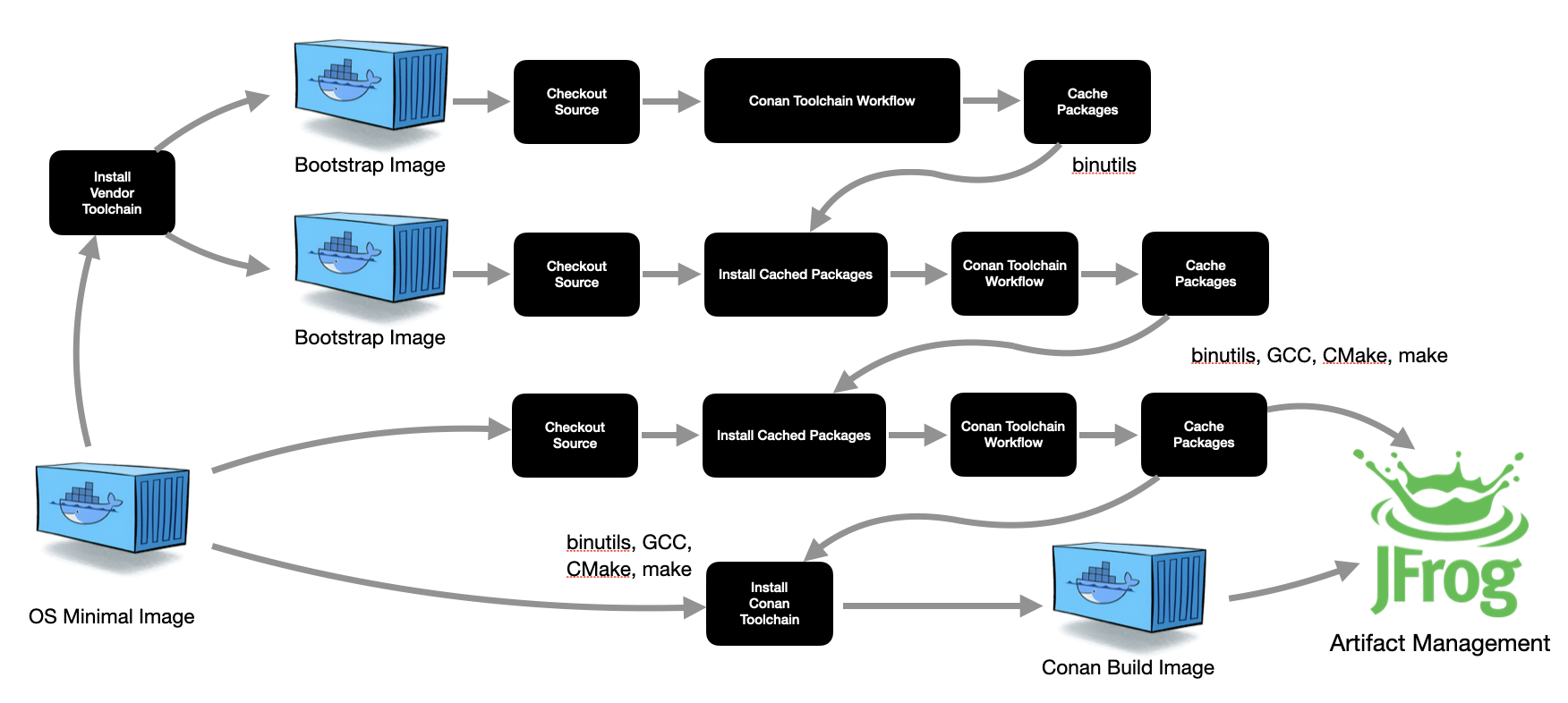 Before we can start on the toolchain, we need minimal base and bootstrap container images that can run conan and build the toolchain using the OS vendor's gcc toolchain packages.